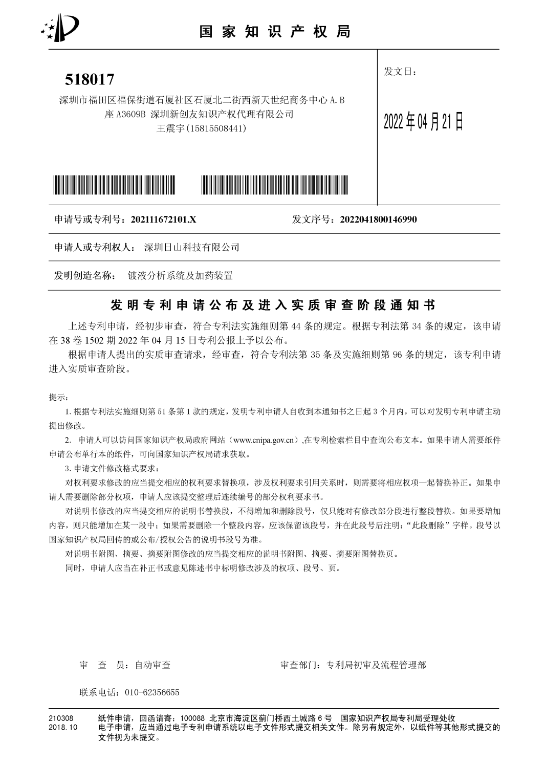 深圳日山科技有限公司发明专利 202111672101.X 《镀液分析系统及加药装置》获申请公布及进入实质审查阶段