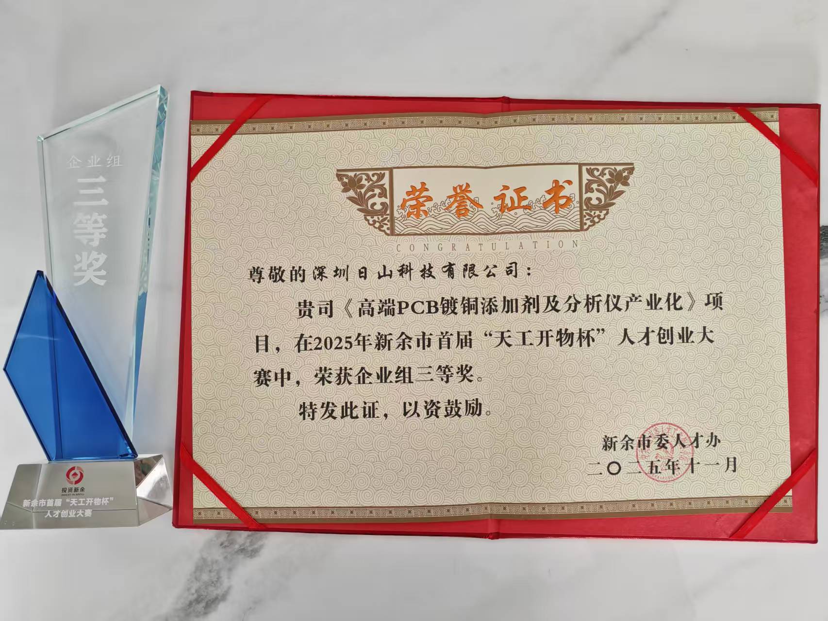 11月11日,新余市首届“天工开物杯”人才创业大赛决赛圆满落幕。在此次汇聚了众多创新力量的盛会中,我司凭借卓越的技术实力,以《高端PCB镀铜添加剂及分析仪产业化》为项目,从众多优秀参赛企业中脱颖而出,成功荣获三等奖。