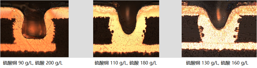 电镀液浓度对盲孔电镀的影响 (1.5ASD x 50分钟):