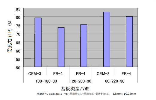 电镀液浓度对通孔电镀的影响 (3ASD x 40分钟,孔尺寸:1.6mm-φ0.25mm ):