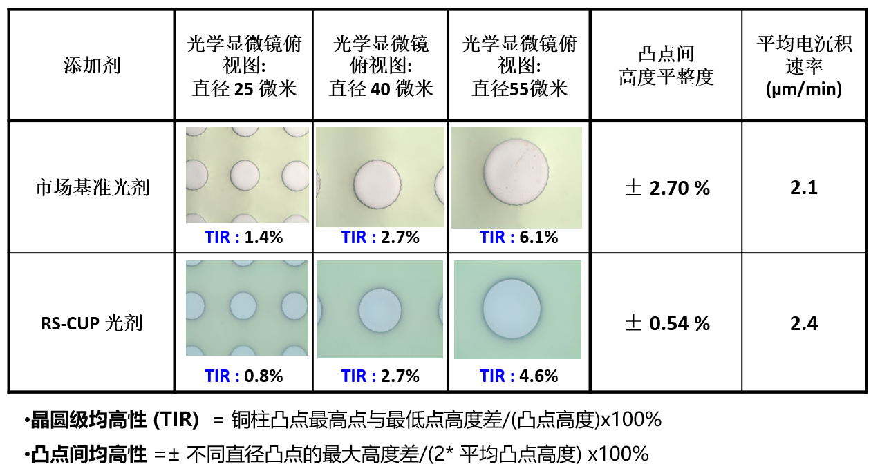 RS-CUP 光剂用于半导体硫酸铜电镀工艺,专为高速厚镀铜柱、重布线层(RDL) 和铜凸点/铜凸点下金属层(UBM)的应用而设计。 它提供卓越的晶圆级、芯片级和微铜凸点级均匀性。能产生具有半亮或光亮外观的高可靠性电镀沉积层。