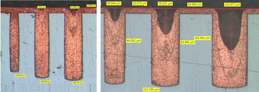 RS-TSV 是一种甲基磺酸镀铜工艺,可填充具有高纵横比的硅通孔 (TSV),而不会产生空隙和其他缺陷。 该工艺专适用的硅通孔直径范围为 5 至 100微米。配合在线添加剂药水浓度检测和管控,工艺稳定牢靠。